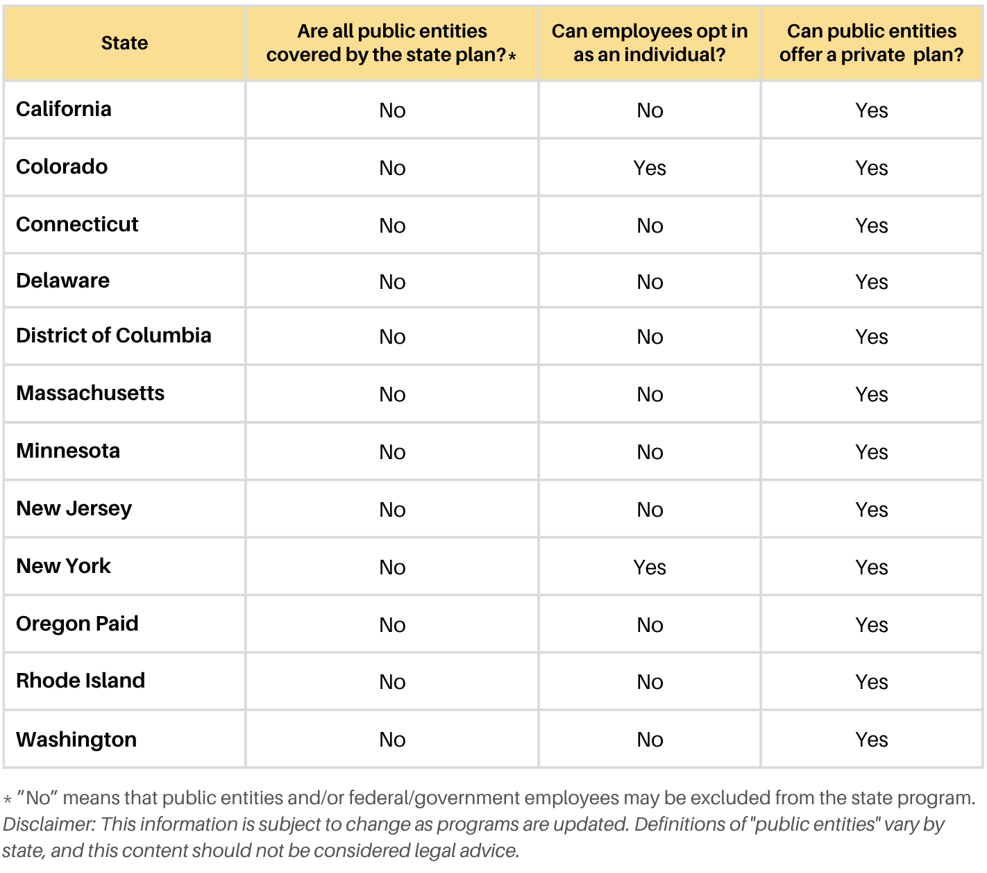 Even in states with robust PFL programs, employees in these groups may be carved out. When that happens, public entities generally have three choices. They can either self-fund paid leave benefits, purchase a private plan that meets or exceeds the state benefit, or do nothing (which is the unfortunate and most common default).